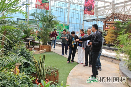 第二天,考察團(tuán)在杭州市園林綠化股份有限公司總裁張炎良、副總裁丁旭升的陪同下參觀了畫(huà)境·青山湖花園中心。該花園中心是一個(gè)集園藝產(chǎn)品研發(fā)、展示和推廣的現(xiàn)代園林高新技術(shù)平臺(tái),致力于打造庭院設(shè)計(jì)、咨詢、建造、養(yǎng)護(hù)等各類功能綜合的一站式園藝服務(wù)中心。項(xiàng)目有近3000畝配套生產(chǎn)基地,12000平米研發(fā)與生產(chǎn)溫室,以及室內(nèi)情景展示區(qū)、園藝展示區(qū),室外陳列展示區(qū)、應(yīng)用展示區(qū)等多個(gè)功能區(qū)塊。其中,用于室內(nèi)園藝展示的4000平方米的展覽溫室,引進(jìn)荷蘭PRINS溫室技術(shù),實(shí)現(xiàn)對(duì)溫度、光照等全智能控制,是一個(gè)技術(shù)含量極高的節(jié)能、環(huán)保型現(xiàn)代溫室。