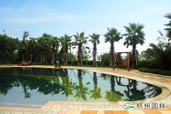 露天泳池區(qū)景觀獨(dú)具特色,選用華棕、棕櫚、布迪椰子、加拿利海棗等熱帶植物作為主景,營(yíng)造出簡(jiǎn)約大方、層次分明的濃郁熱帶園林風(fēng)情。為了提高這些熱帶植物的成活率,降低后期的養(yǎng)護(hù)成本,這批植物都經(jīng)過(guò)馴化,較能適應(yīng)吳江的氣候條件。該區(qū)面積較大,從酒店的觀景平臺(tái)上往下看,泳池中間的小島就像彎彎的小船,仿佛要順流而下;水質(zhì)清澈見(jiàn)底,水底大面積的藍(lán)色和黃色玻璃馬賽克,營(yíng)造出波光鱗鱗的效果,偶有微風(fēng)吹來(lái),水面蕩起陣陣漣漪,流動(dòng)的線條瞬間充滿了生機(jī)和活力,整個(gè)泳池仿佛都動(dòng)了起來(lái)。岸邊的植物高大茂密,郁郁蔥蔥,透過(guò)樹叢的間隙,浩渺無(wú)邊的太湖水系與遠(yuǎn)處的天際線連接在一起,恍然之間,好象是來(lái)到了充滿陽(yáng)光、海浪、沙灘的南國(guó)熱帶海域,心情的舒暢不言自喻。