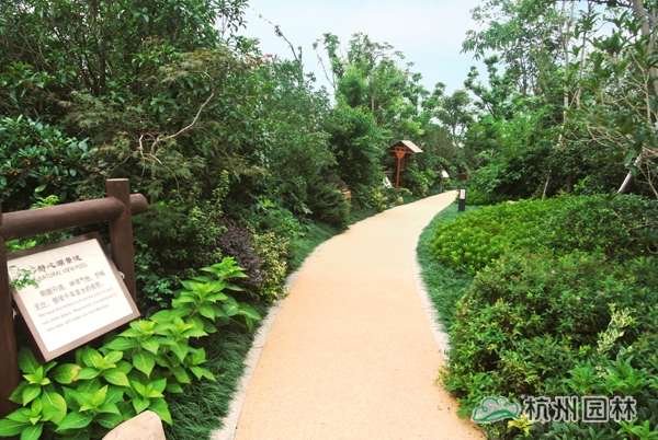 五千年的中國(guó)歷史文化,恢宏浩瀚,為園林造景提供了取之不竭的素材;園林景觀,也因?yàn)閭鞒辛松詈竦奈幕滋N(yùn)而散發(fā)出獨(dú)特的藝術(shù)魅力。作為一個(gè)旅游度假項(xiàng)目,對(duì)園林景觀的要求,不僅僅只是精致大氣、風(fēng)韻天成的美景,更需要有深厚的文化底蘊(yùn),彰顯獨(dú)一無(wú)二的中國(guó)元素。為此,在2號(hào)樓大廳門前,用植物造景再現(xiàn)代表中國(guó)書法中筆畫大體的“永”字八法,彰顯中國(guó)書法的魅力;在泡池的建造上,運(yùn)用老石碾、壓門石、老磨盤等老石材,打造出懷舊氣息濃郁的鄉(xiāng)土風(fēng)情。