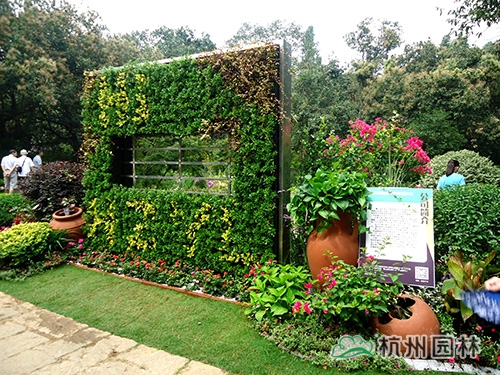 走進畫境園,只見主入口左側(cè)種植著兩株一高一矮的厚皮香樹,郭昌如笑著說,“這兩棵厚皮香寓意的是兩個萬分自豪的森林衛(wèi)士——熊大和熊二,你看,熊二還滿臉熱情地向游人不停地招手示意呢?!敝魅肟谟覀?cè)是一面立體綠植墻,所用的植物主要為黃金絡(luò)石、金寶石冬青、小葉梔子花、金邊黃楊等?!傲Ⅲw綠植墻是立體綠化的主要形式,畫境?青山湖花園中心推出的這款立體綠植墻產(chǎn)品,可以根據(jù)客戶需要,結(jié)合氣候、溫度、濕度、色彩等綜合條件,選配四季長綠或色彩豐富的植物,隨時在人們想要的地方構(gòu)建出一個貼近自然又超脫自然的生活環(huán)境,可謂是簡單又方便?!惫缃榻B道。立體綠墻的兩側(cè),隨意地散落著一些紅陶罐,與金寶石冬青、龜甲冬青等精品球形植物,三角梅、月季、常春花、雞冠花等花卉,紫葉狼尾草、晨光芒、矮蒲葦?shù)扔^賞草混搭,營造出一種溫暖、和煦的庭院景觀?!叭绻丫G植墻看成是城市的建筑,此景則喻意美麗杭城的繁華一角?!惫缪a充說。綠植墻的中間還別出心裁地設(shè)置了一扇窗戶,透過它,園內(nèi)的美景已隱約可見。