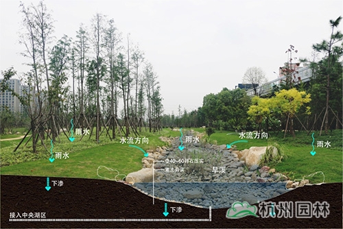 旱溪布置于帶狀綠地低洼處。設計時仿造自然界中干涸的河床,配合濕生植物的營造,在意境上表達出溪水的景觀。降雨時可減緩地表徑流,起到緩排作用。旱溪底部接盲管,將水導入中央湖區(qū),進行儲存。