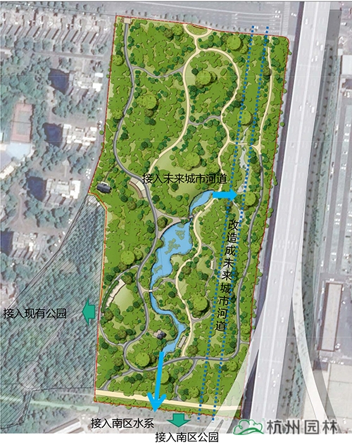 江干區(qū)東湖路市民公園位于東湖路與九喬街西南角,毗鄰九月庭院和泊林印象小區(qū),是江干區(qū)“一帶生態(tài)功能區(qū)”的“運河—錢塘江—東湖路”U型生態(tài)軸的重要節(jié)點。結(jié)合已建成公園和高架互通施工預留地,對東湖路市民公園進行統(tǒng)一規(guī)劃。