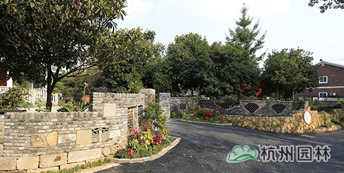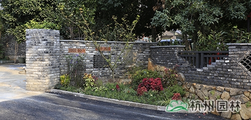 錢三組共有31戶人家,以前,這里家家都是高墻大院,雖然每家的小樓都蓋得很有特色,但卻被高高的院墻擋住了院內(nèi)的風(fēng)光,而且整體綠化景觀單一,缺乏本土特色和文化氣息。如今,高高的圍墻被拆除,改為以舊青磚為主,搭配鋁合金欄桿,以老石板、舊瓦片、老石磨、老石鼓等作為點(diǎn)綴,懷舊物件與現(xiàn)代元素有機(jī)結(jié)合,營(yíng)造出全新的集古樸與時(shí)尚于一體的敞開式景墻。在景墻內(nèi)側(cè)種植桂花、意大利絡(luò)石等綠籬,墻外地面種植麥冬等常綠草本植物;在每家庭院入口兩側(cè)和一些節(jié)點(diǎn)處設(shè)置小花境,種植各類常綠、色葉、草花等植物,營(yíng)造出風(fēng)格多樣的花境景觀,在軟化景墻生硬感的同時(shí),景觀更加豐富多變。