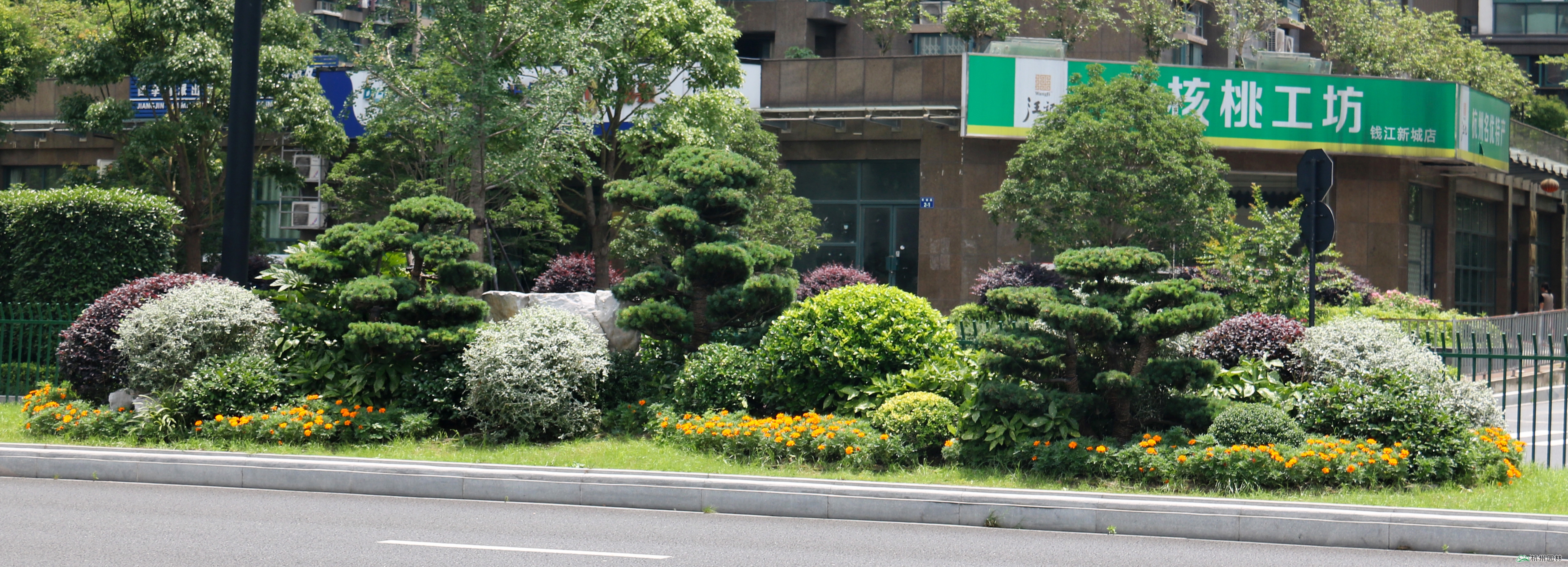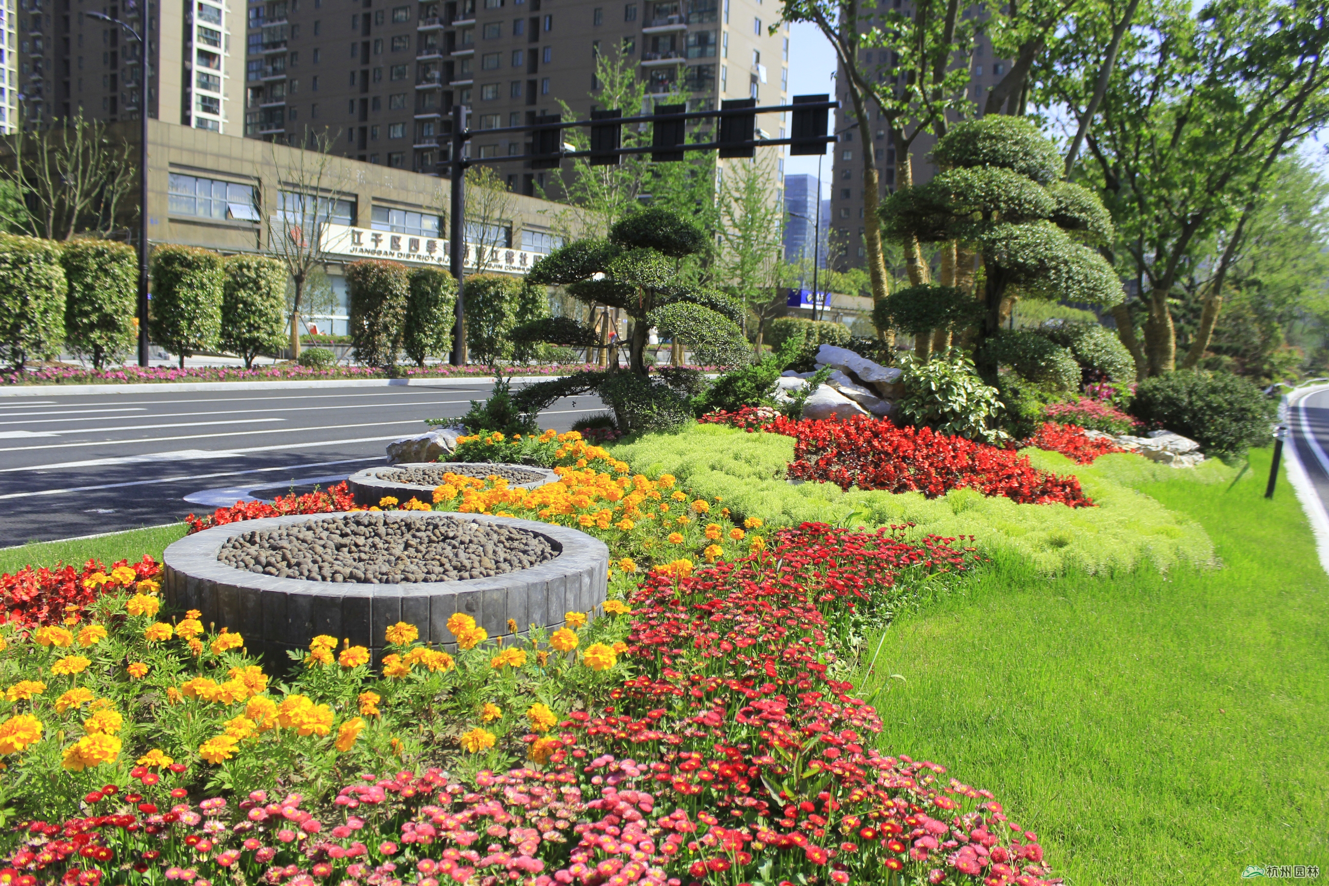 在道路十字路口及一些重要節(jié)點,則通過造型樹、球類植物、景石等的有機結(jié)合,采用盆景化的造園手法,景觀效果獨具特色。從而使得新塘路成為四季常綠、三季彩葉、全年花開不斷的“最美”迎賓大道。