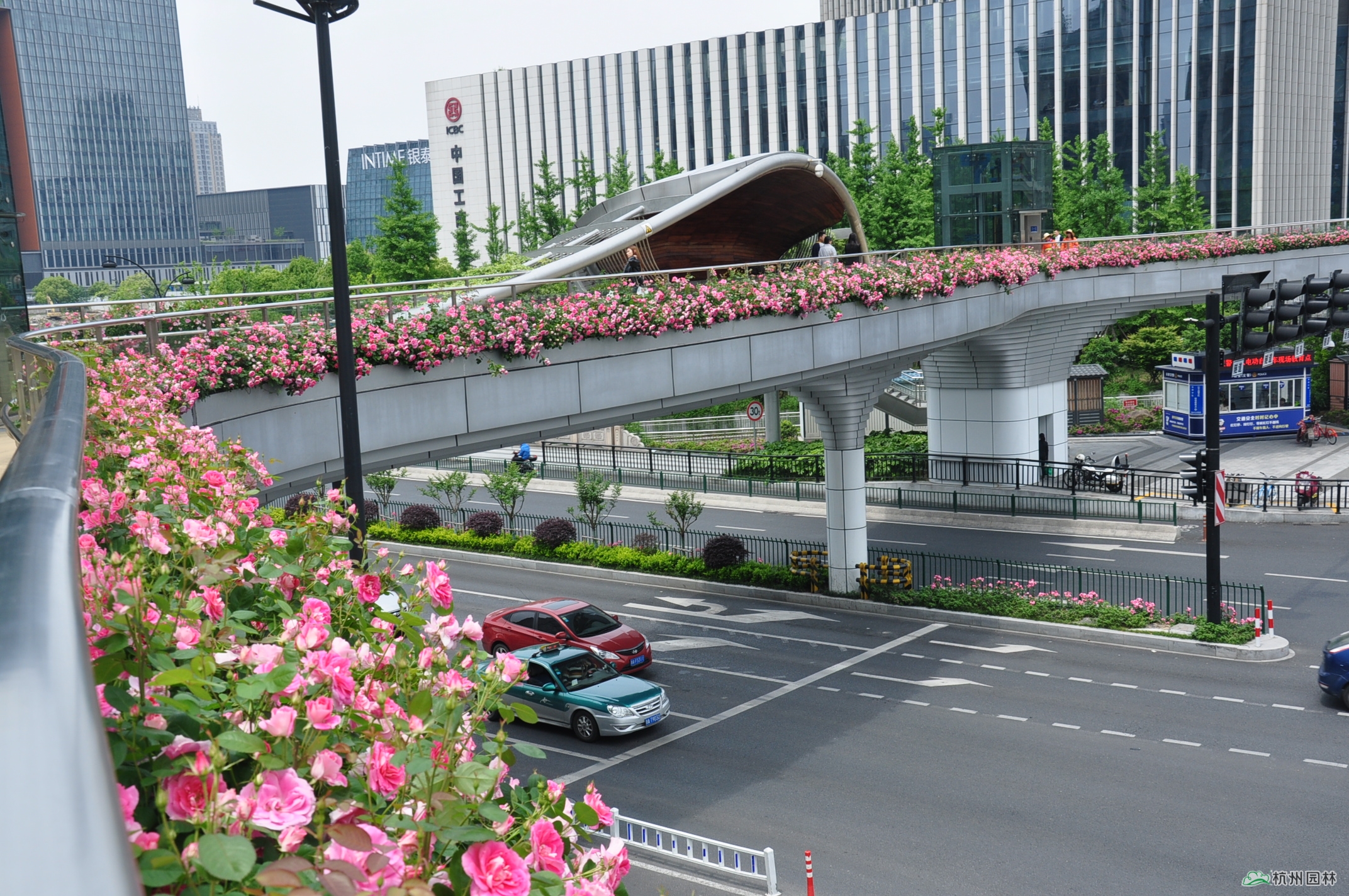 位于新塘路和慶春路交叉口的慶新天橋是新塘路綜合整治工程的標志性建筑之一,也是杭州首座仿生態(tài)學(xué)原理的異形人行天橋。橋面獨特的景觀造型宛如一條風(fēng)景秀美的彩色飄帶,大量月季沿橋面外側(cè)護欄種植,月季花盛開時節(jié),橋面仿佛戴上了一條色彩絢麗的花環(huán),美不勝收,充分體現(xiàn)了杭州包容、大氣、開放的時代風(fēng)貌、都市氣質(zhì)和國際視野。